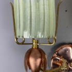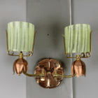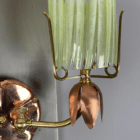 This pretty art nouveau style wall light features a copper lily pad back plate and tulip on each arm. Striped opalescent glass shades are seated within a decorative brass framework.