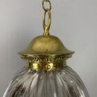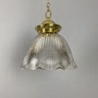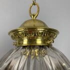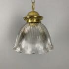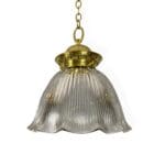 Prismatic Holophane Glass shade with a frilled edge. Fitted with a solid brass Holophane style domed gallery with cut out vent detail around the upper rim.