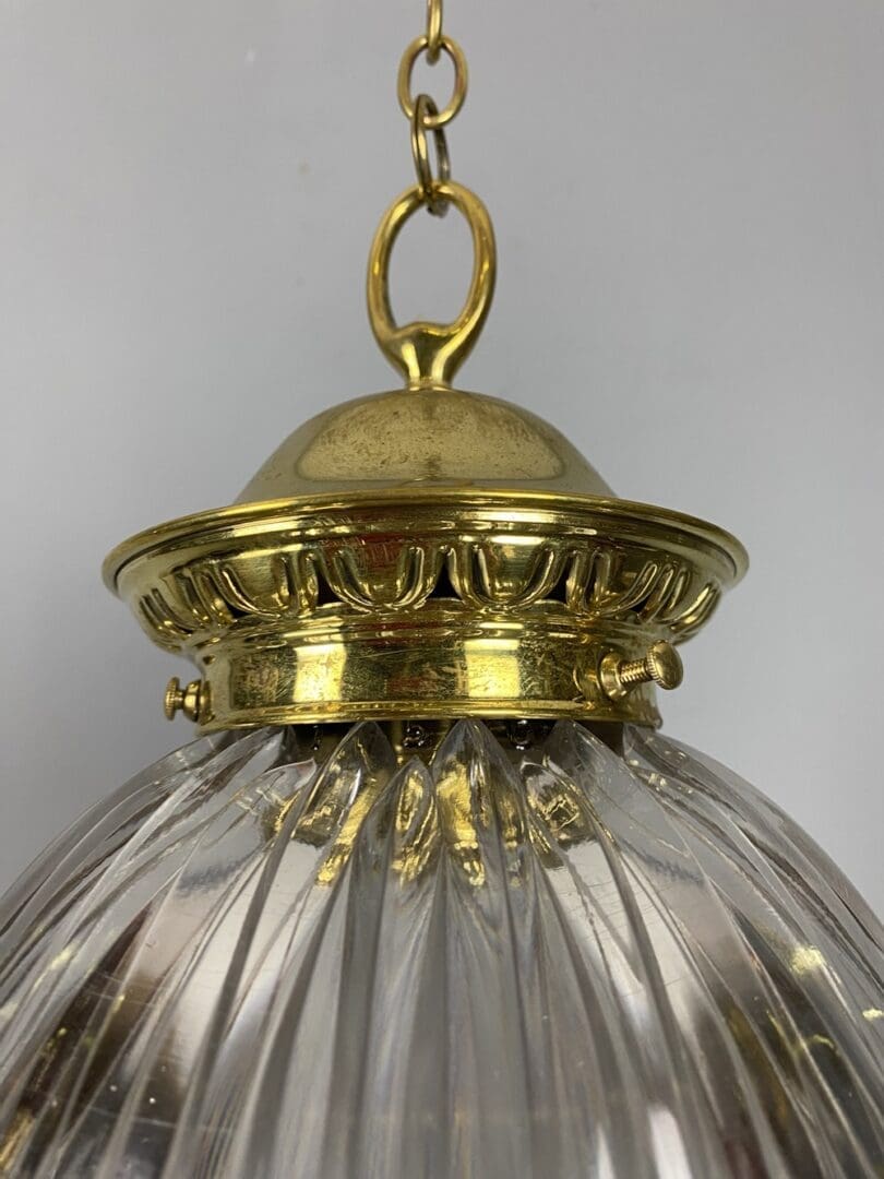Prismatic Holophane Glass shade with a frilled edge. Fitted with a solid brass Holophane style domed gallery with cut out vent detail around the upper rim.
