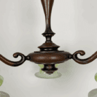 The simplest three arm chandelier. The frame dates back to the early 20th century and is made from brass with a copper oxide finish. The shallow scrolled arms hold elegant opalescent glass shades with delicate stripe.