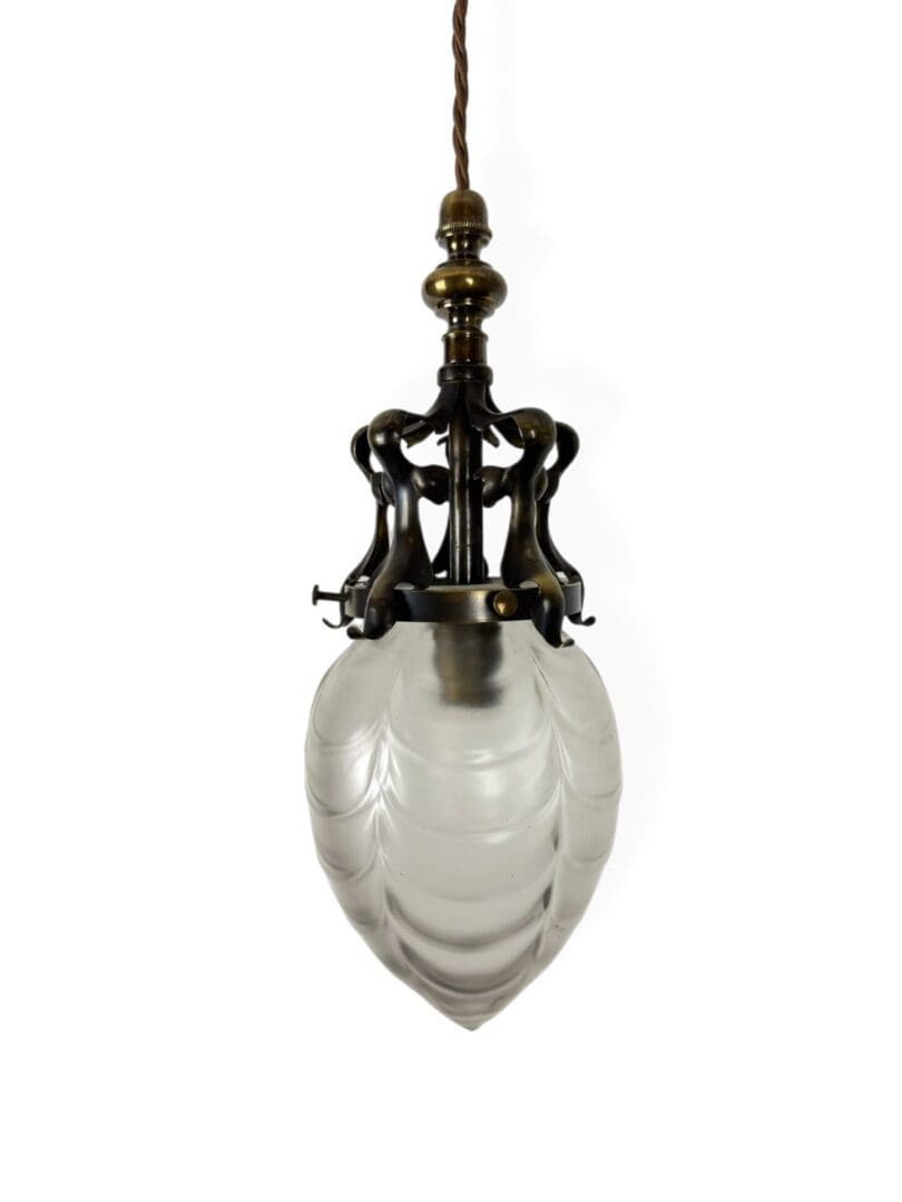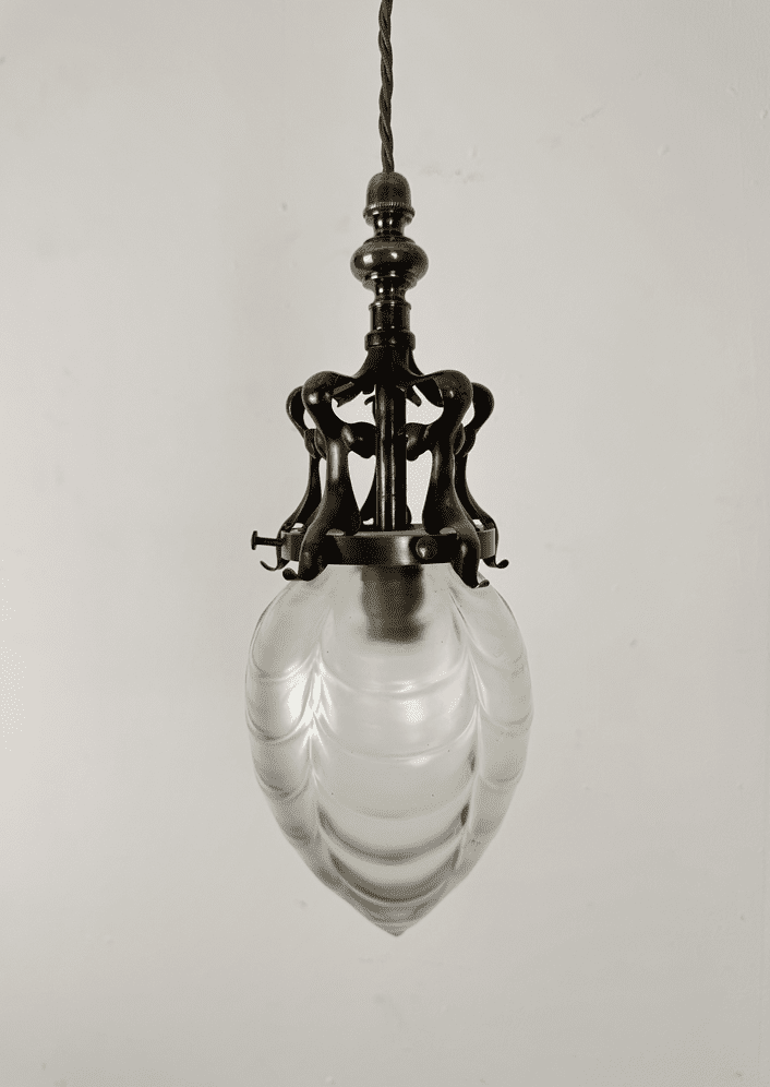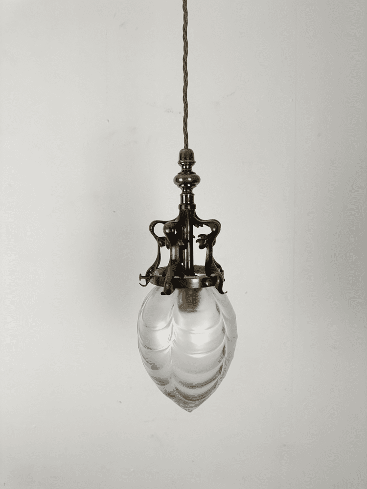 A small and all original art nouveau pendant light. The Powell glass shade is frosted and features a crescent pattern.