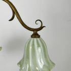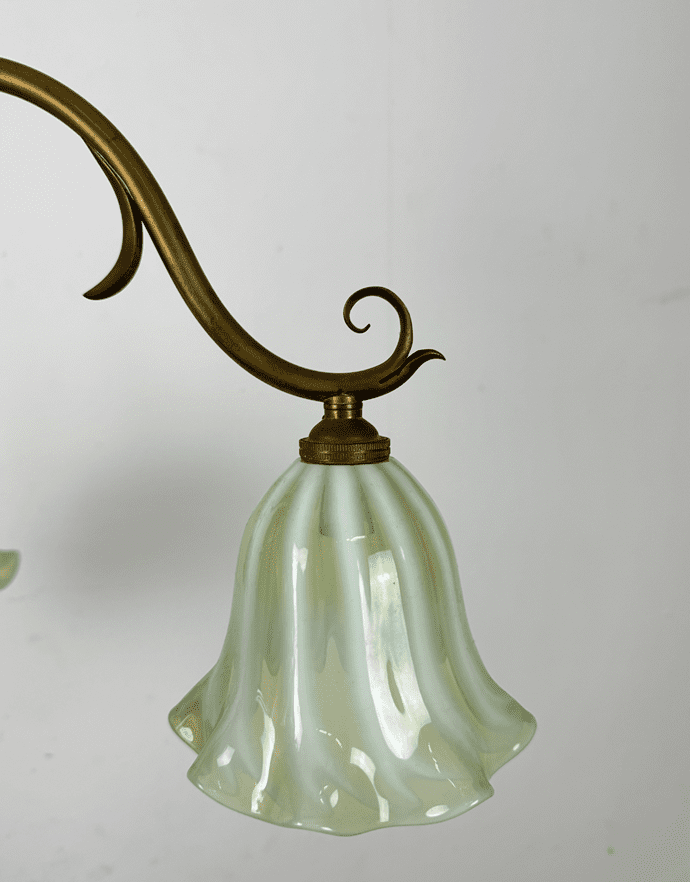 Fitted with striped opalescent glass shades with frilled edge. Glass Shades have been hand made for us by a British based artisan glass blower.