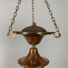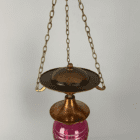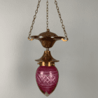 This arts and crafts pendant light combines a beautiful cranberry crystal shade suspended from a copper canopy.