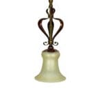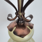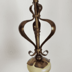 A classic arts and crafts pendant light with a beautifully designed crown-like fixed stem featuring decorative copper arms curving along the brass stem.