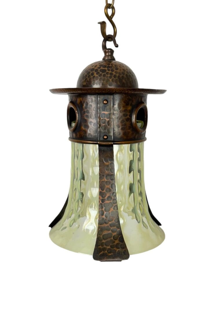 Fitted within a hammered copper framework featuring domed top with circular cut outs in the skirt and hammered side straps which support the glass. Copper has antique finish and great patina.