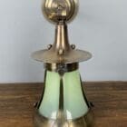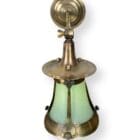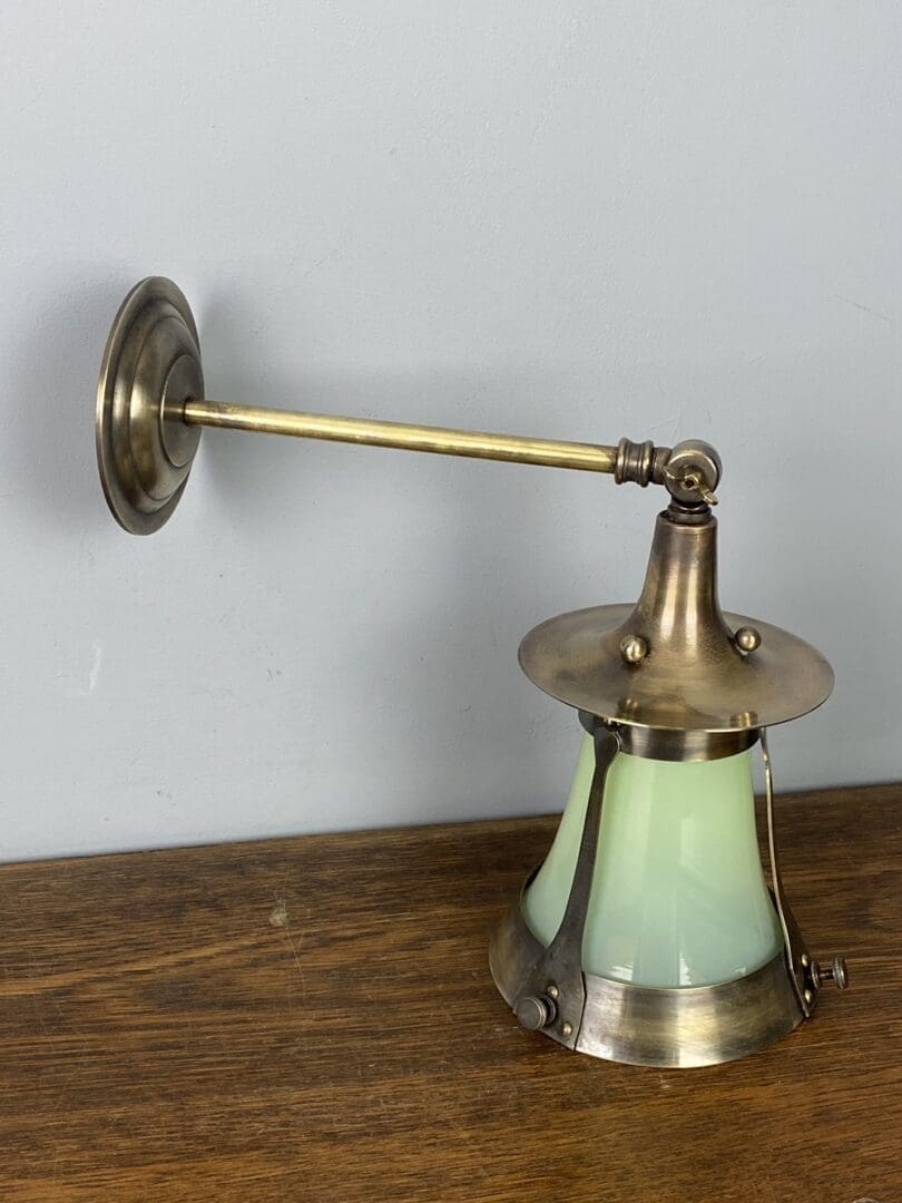 This small Arts and Crafts style wall lantern is based on an early 20th century design by GEC. A simple design, the brass frame enclosing an opalescent glass shade. Fitted to a straight arm wall bracket with cast brass back plate. A handmade wall lantern, carefully crafted in our South Derbyshire workshop. The opalescent glass shade has been hand blown especially for us by a UK based artisan glass blower.