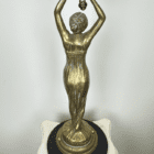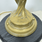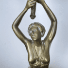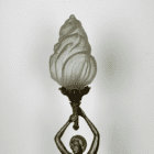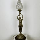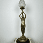 A beautifully designed lamp featuring a figure of a lady in a Grecian style flowing dress. Her arms are stretched above her head holding a flaming torch.