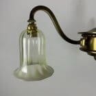 Brass frame dates back to the early 20th century. Bell shaped opalescent glass shades have been handmade for us in the UK by an artisan glass blower.