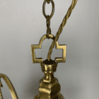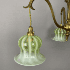 A delicate art nouveau chandelier. With simple decorative detail to the ends of each arm and the central stem. Striped opalescent glass shades are suspended from each arm.