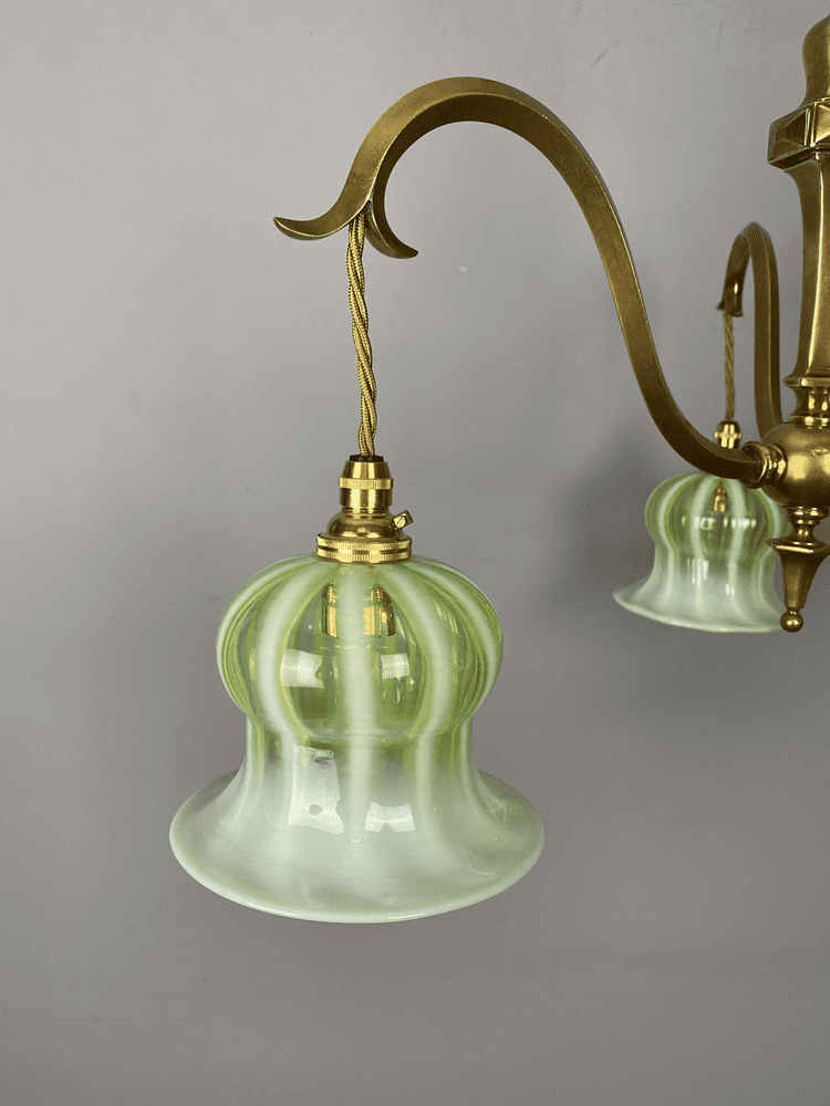 A delicate art nouveau chandelier. With simple decorative detail to the ends of each arm and the central stem. Striped opalescent glass shades are suspended from each arm.