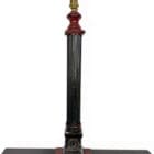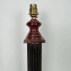 A tall table lamp, made from brass. The base has been given a mahogany paint effect. The reeded stem is painted black.