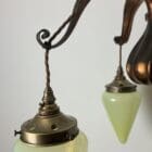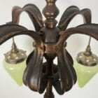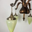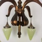A bold and striking original arts and crafts chandelier. This four arm chandelier features a dark oxidised copper frame with draped cables suspending cone shaped opalescent glass shades.