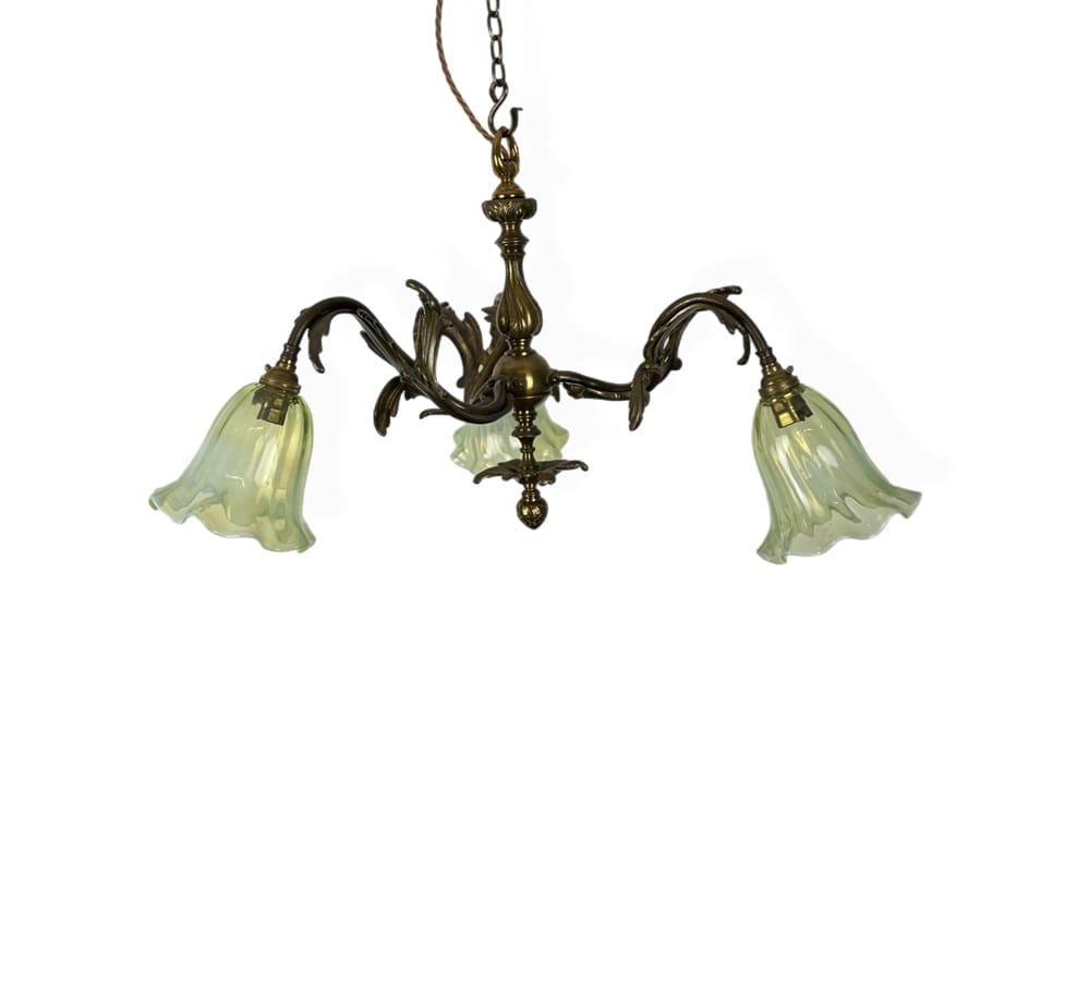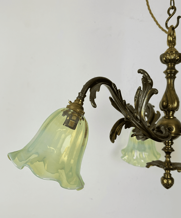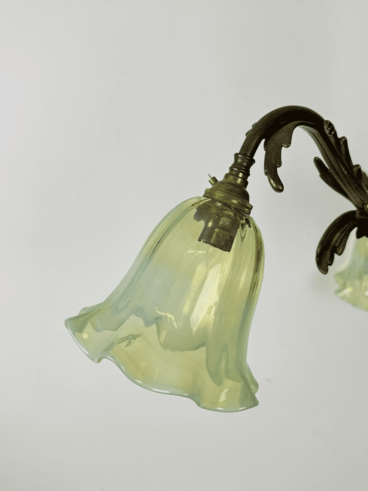 Fitted with frilled opalescent glass shades.  Hand made for us by a UK based glass blower.