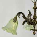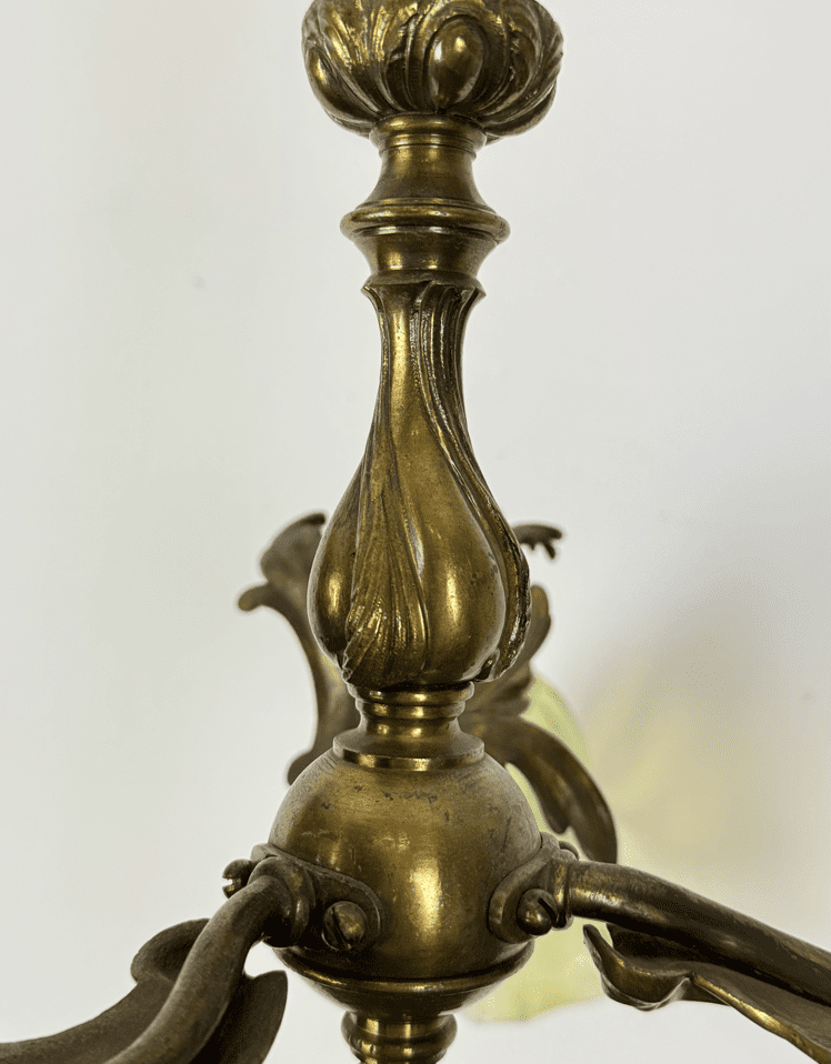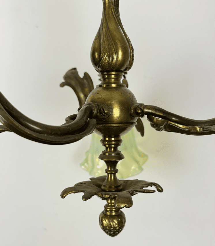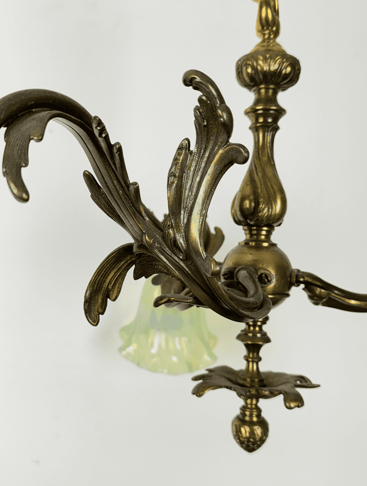 A small chandelier, shallow enough for a room with a lower ceiling .  This classic rococo style has a free-form leafy design in brass and dates back to the early 20th century.