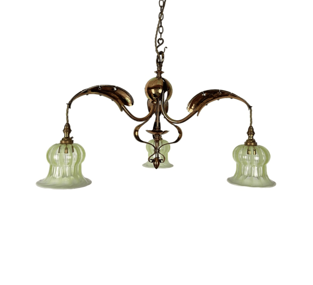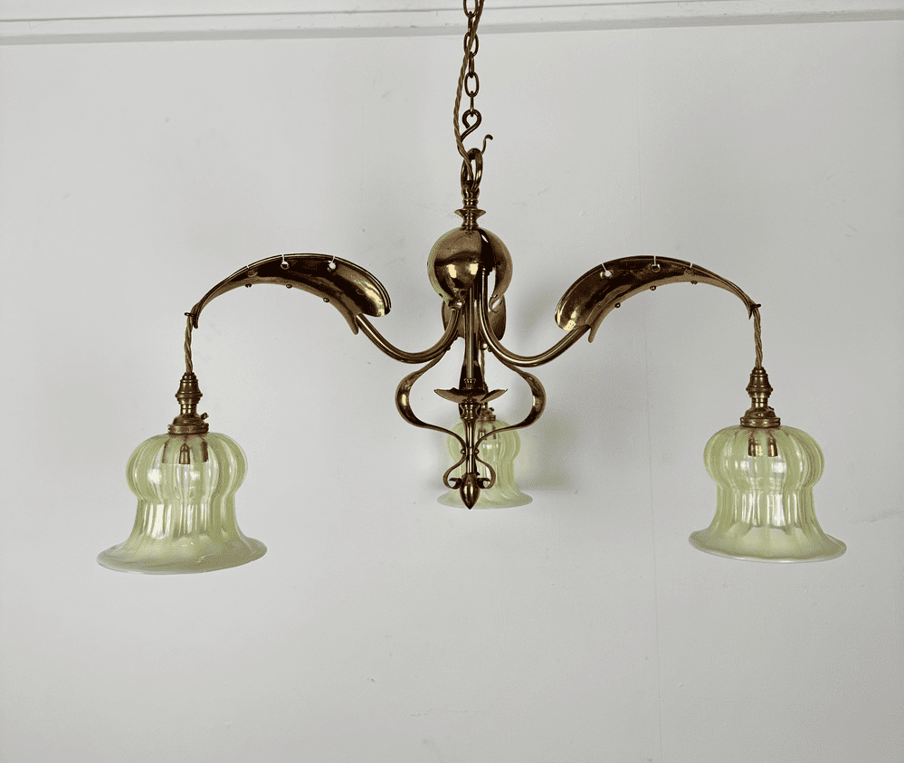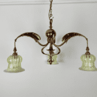 A three arm chandelier in distinctive arts and crafts style. Framework is made of brass with an oxidised copper finish.