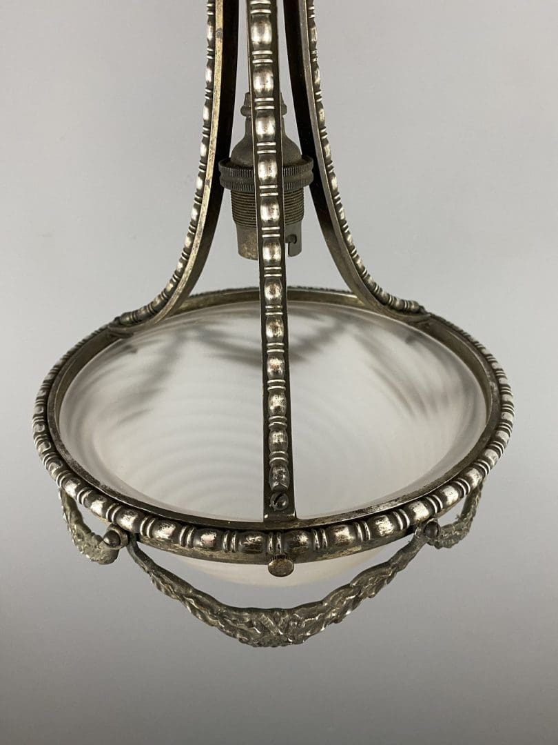 A small and pretty chandelier in the empire style. A frosted glass bowl (attributed to James Powell) sits within a fancy ring with swag detail.