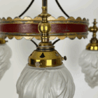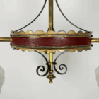 The central ring of this chandelier is painted dark red with contrasting gilt finish to the scalloped edge. Central stem has simple scroll detail in brass.
