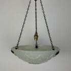 Suspended from three aged chains which are attached to the bowl with decorative fixings. Fittings are antique brass.
