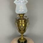 An impressive antique oil lamp with decorative vase shaped brass base standing on a black marble base.   The tops of the side handles are decorated with the man  in the moon.