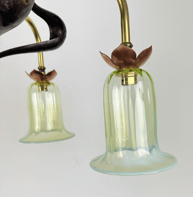Fitted with opalescent glass shades. Hand made for us by a UK based glass blower.