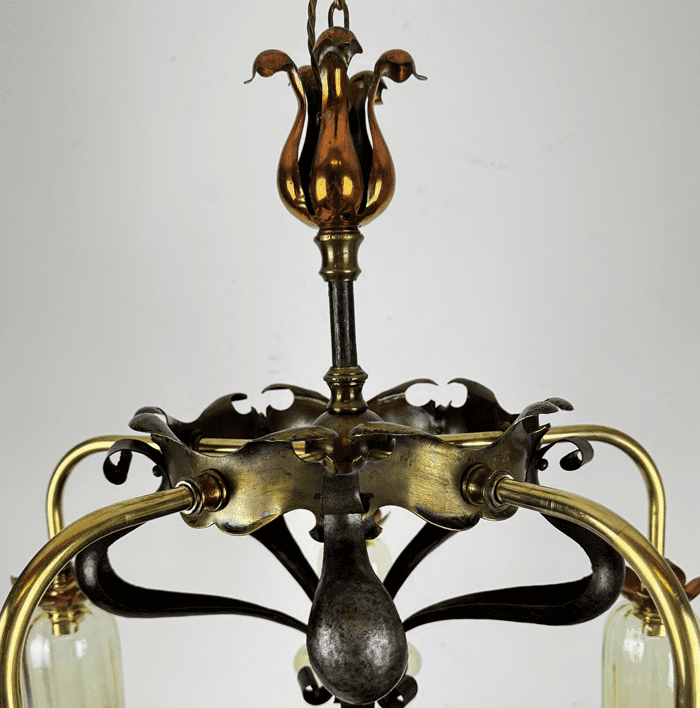 A splendid large Arts and Crafts chandelier. Combining black wrought iron, brass and copper for maximum effect
