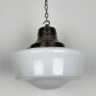 A large shade in opaline white glass in the classic chapel shape. Fitted with an Ashby Hand Made Gallery in Solid brass. shown here with a dark aged finish. Also available in polished brass. Please enquire.