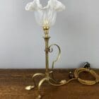 A delicately formed brass table lamp with an almost animal-like pose. Sitting on three feet with exaggerated curved form to the front legs and a scrolled side arm.