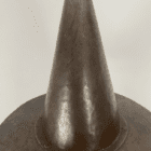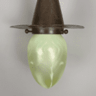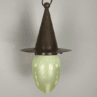 This all original arts and crafts light has a simplistic design of the classic witch’s hat gallery in dark aged copper with a subtle hammered finish. The vaseline glass shade has a satin finish and features a delicate pattern within the glass.