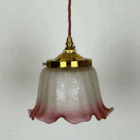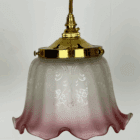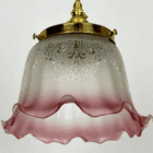 A pretty pendant light with frilled pink edge and a delicate pattern to the etched glass.