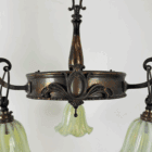The framework of this chandelier dates back to the early 20th century. It is constructed of brass with a copper oxide finish. The ring is adorned with decorative detail and features three hoops from which the glass shades are suspended.