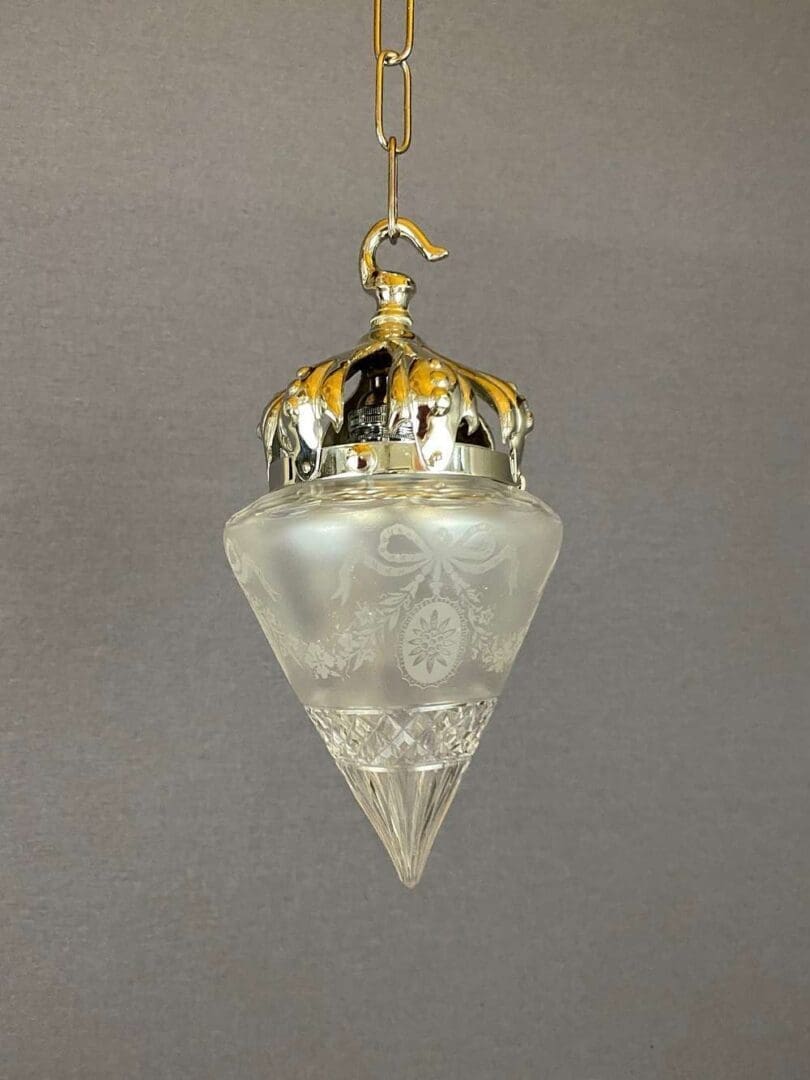 A pretty vintage shade with a a delicate etched and cut glass pattern. The top is a chromed brass crown design