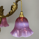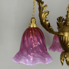 Fitted with three cranberry glass shades with frilled rims. These hand blown glass shades have been made for us by a British based artisan glass blower.