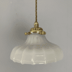 A small antique moonstone glass pendant light. Fitted with a cast brass gallery with ridged detail and a cord grip fitting.