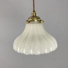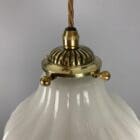 A small antique moonstone glass pendant light. Fitted with a cast brass gallery with ridged detail and a cord grip fitting.