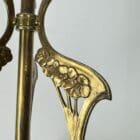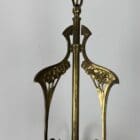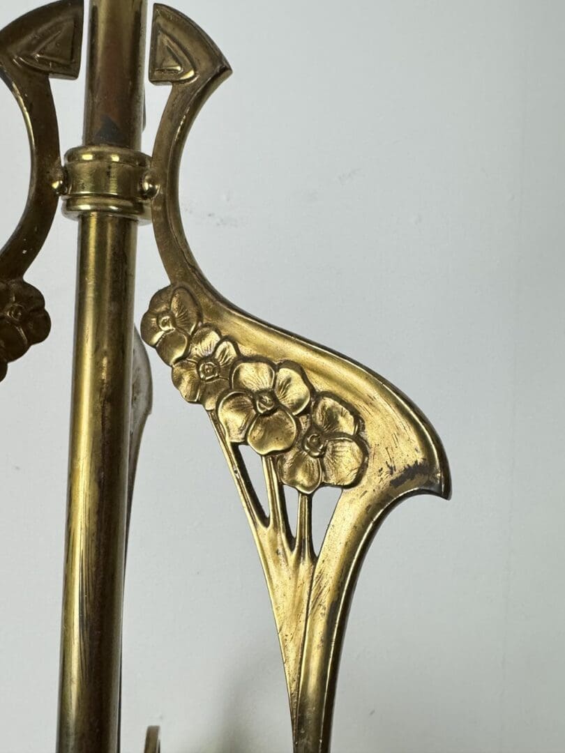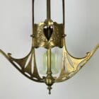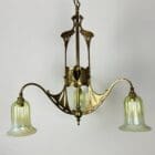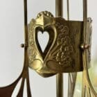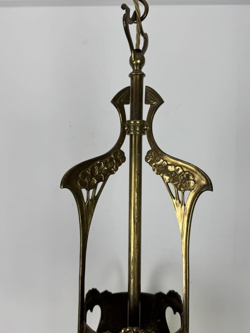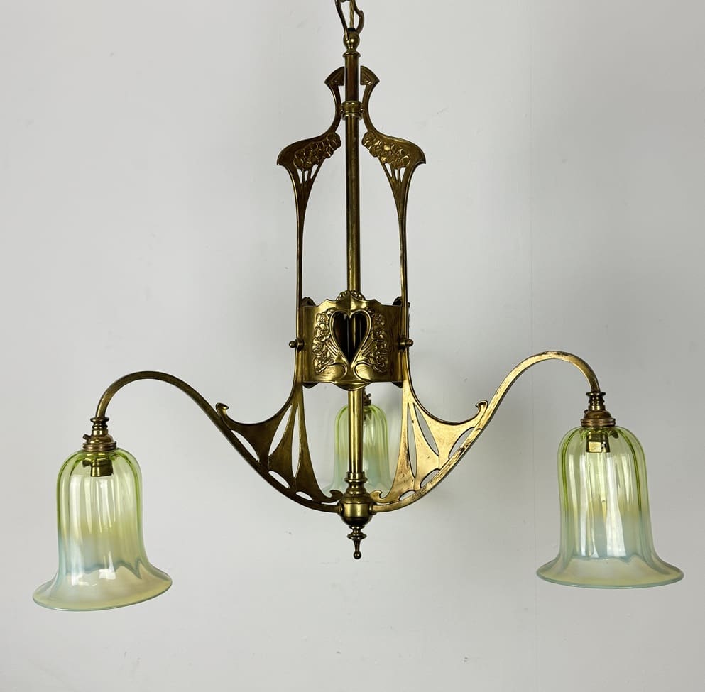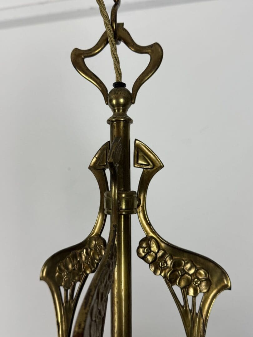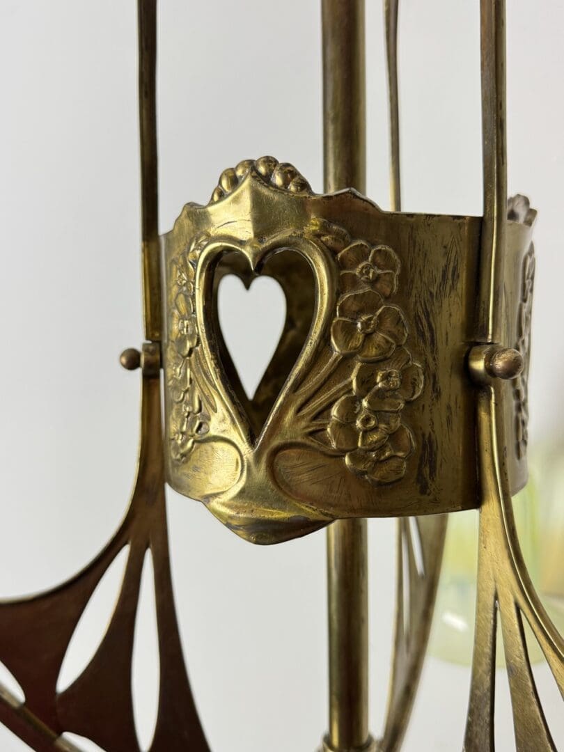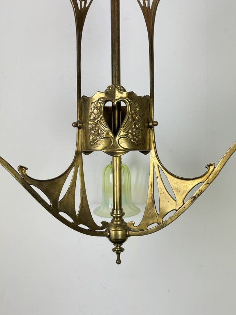 The frame of this chandelier is original art nouveau and dates back to the early 20th century. The brass has an aged patina. Lots of great detail – in particular the heart shaped cut outs to the centre column.
