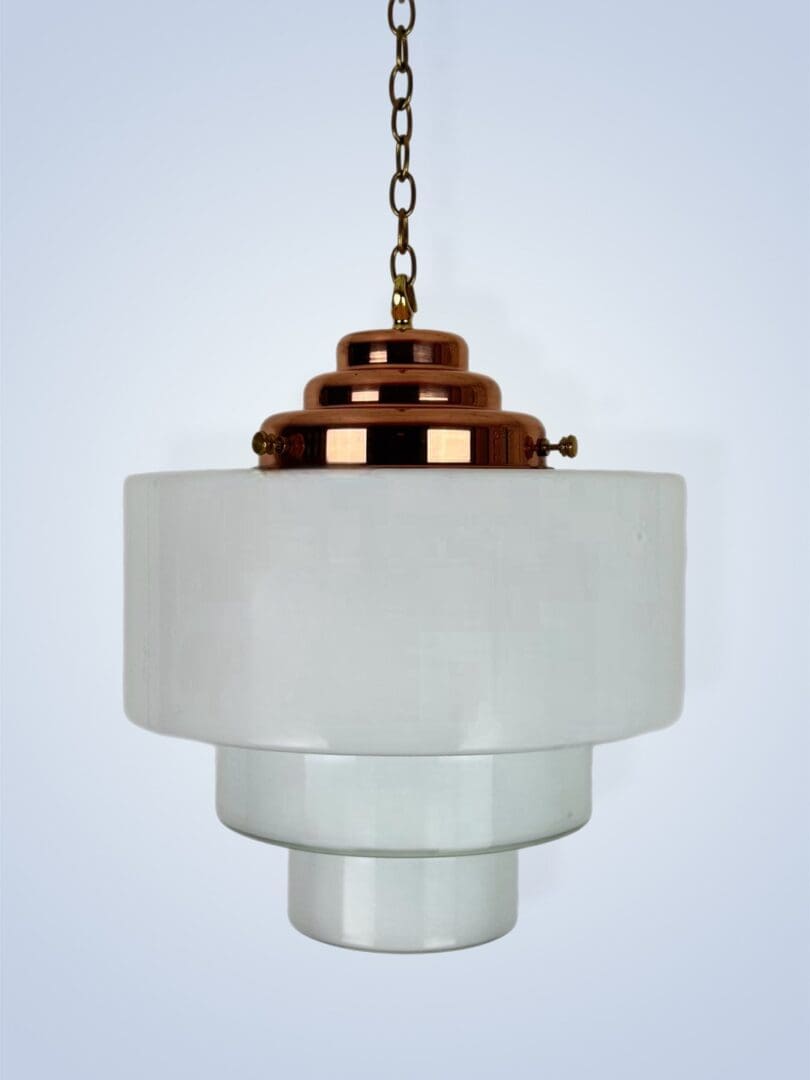 This art deco era pendant light features a simple design with clean lines and a gentle stepped base.