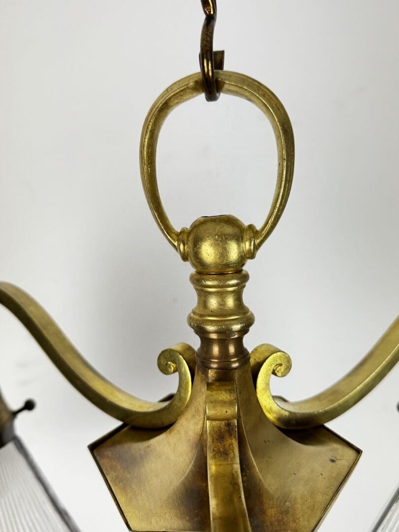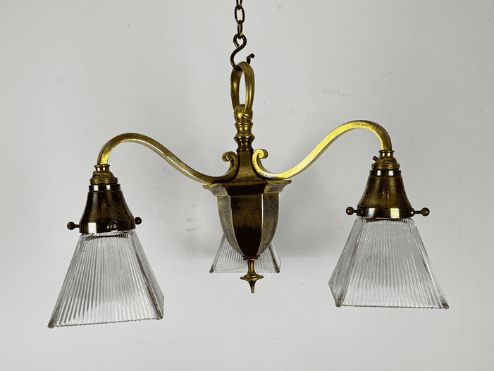 A brass framed chandelier. Brass is unlacquered and has a light patina. Fitted with antique Holophane glass shades in square form.