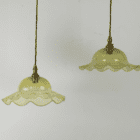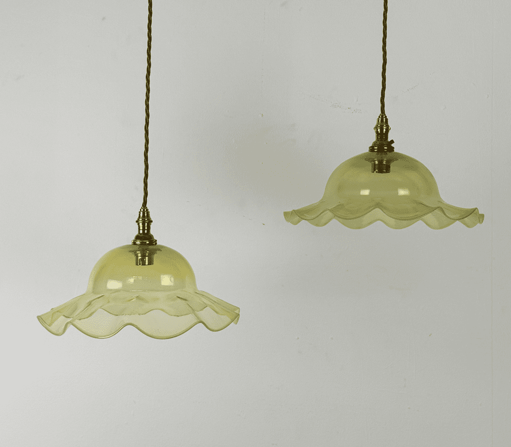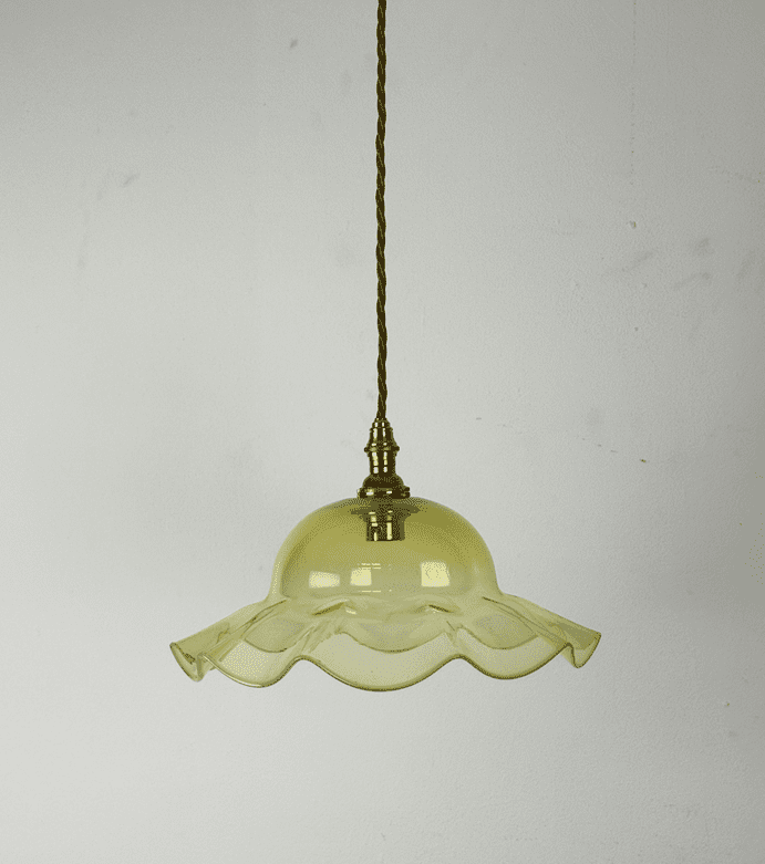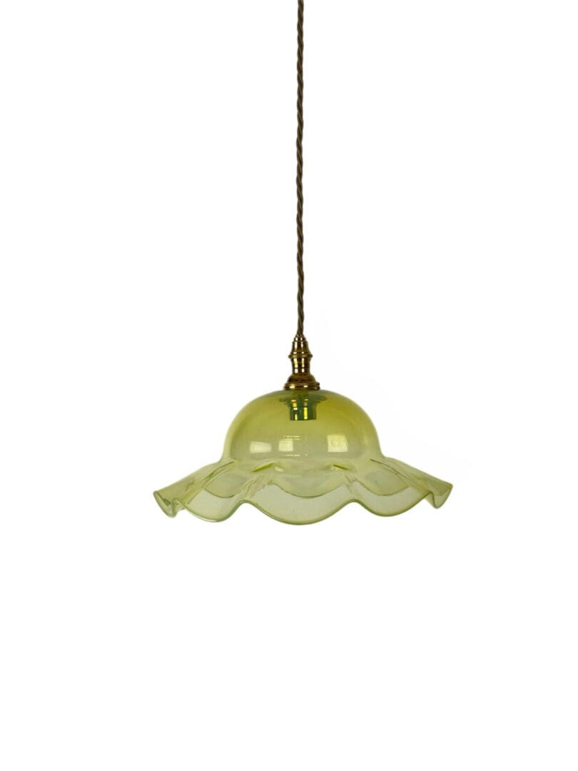 A delicate coolie light in vaseline glass with frilled edge.