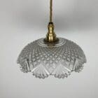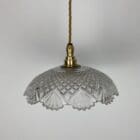 A vintage cut glass coolie light with scallop shell edge. Complimented with polished brass fittings.