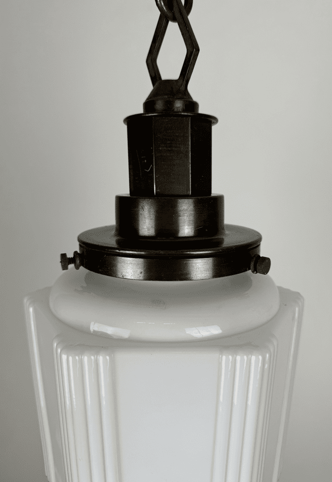 An Art Deco Pendant light in the classic geometric style with nicely detailed grooves and steps. Fitted with an antique brass gallery with tall stepped features.