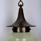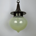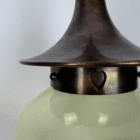 A beautifully bold pendant light combining a teardrop shaped vaseline glass shade under a copper witch’s hat gallery.