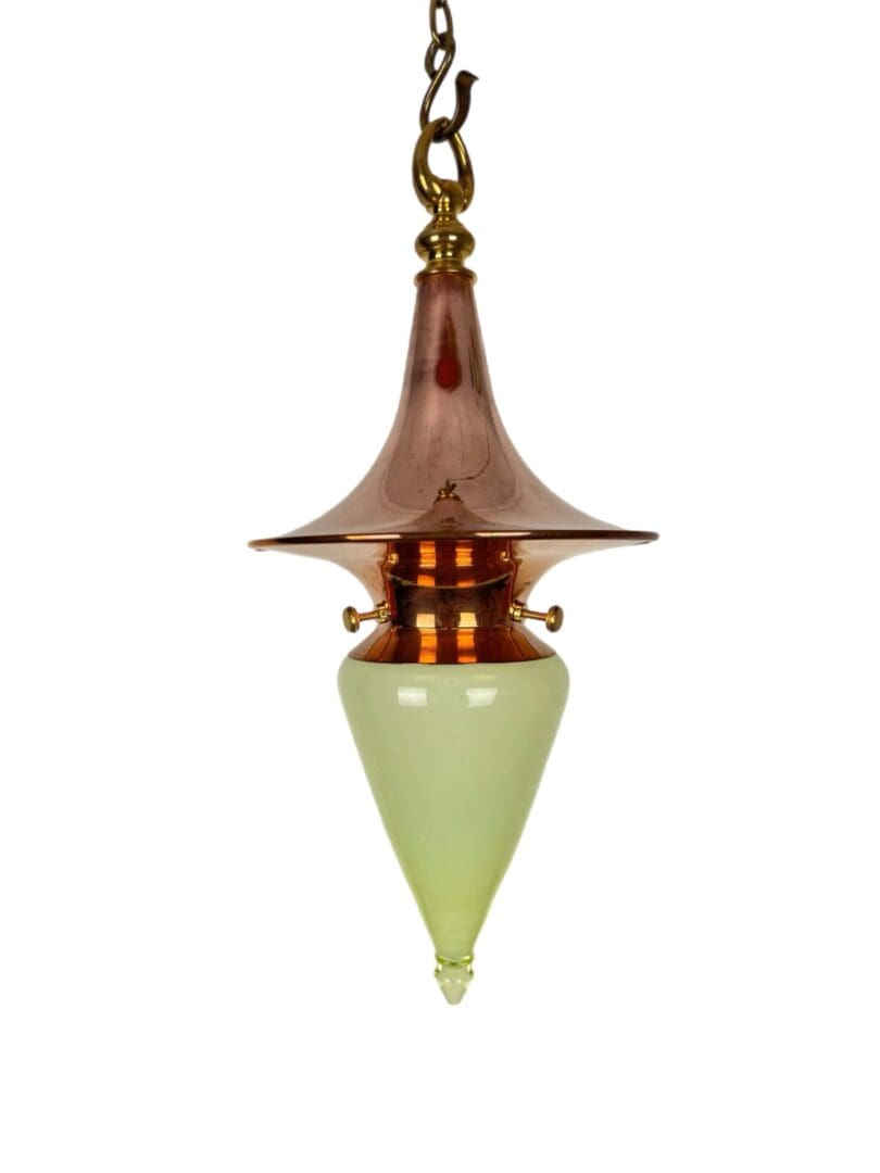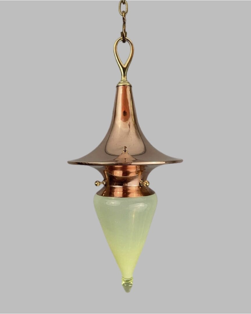 ‘WITCH’S HAT – SLEEK’  Polished Copper Art Nouveau Vaseline Glass Pendant Light