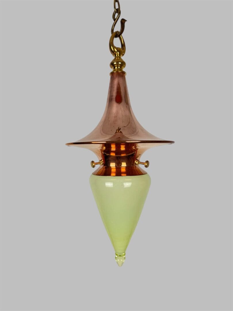 Be the first to review “‘WITCH’S HAT – SLEEK’ Polished Copper Art Nouveau Vaseline Glass Pendant Light (41034)”