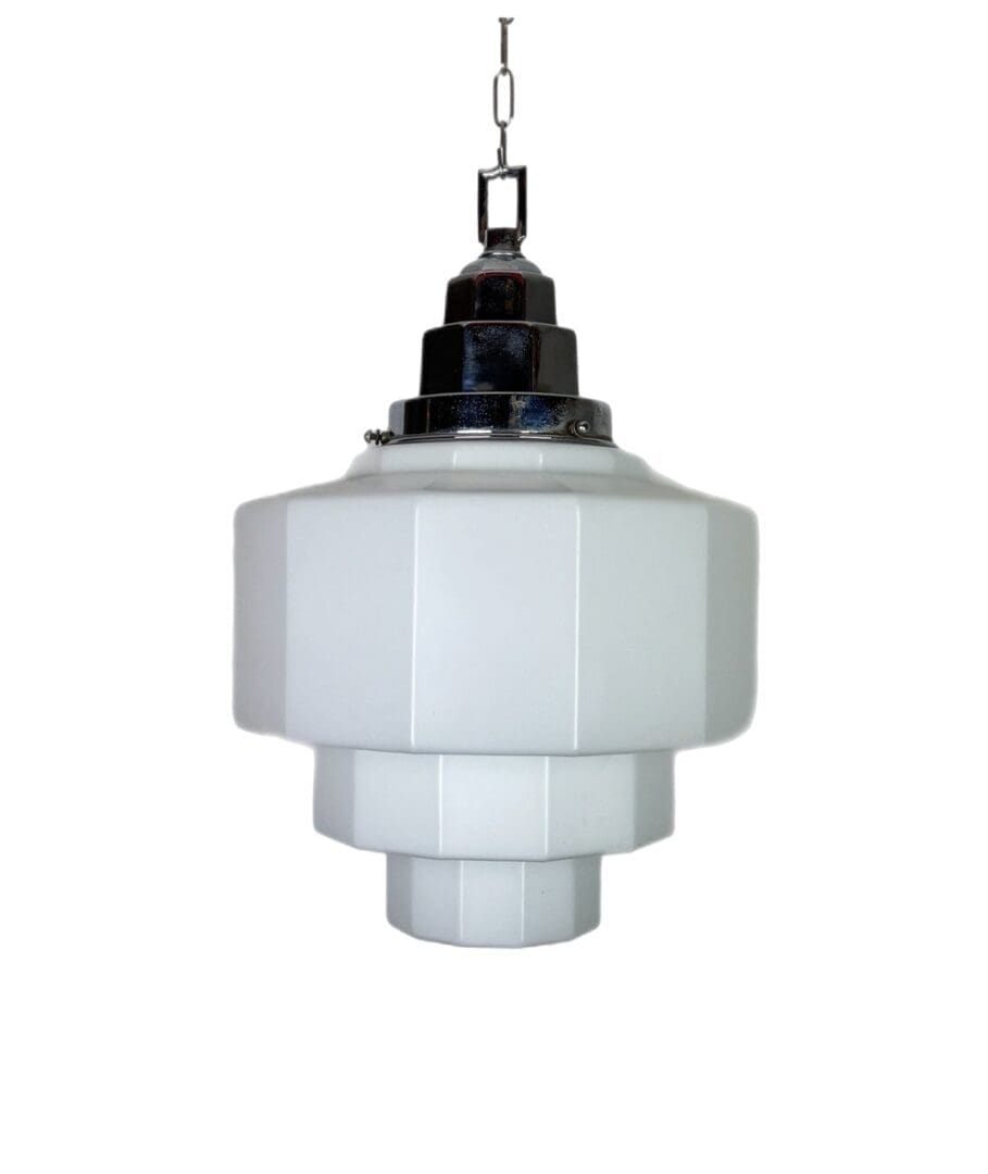 An Art Deco Pendant light in the classic geometric style. Twelve sides and three graduated steps.