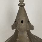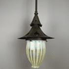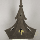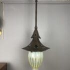 A large scale Arts and Crafts light dating back to the early 20th century. A simple and striking design with spade shaped vent detail on the canopy. Framework is made of hammered copper with a dark oxidized finish.